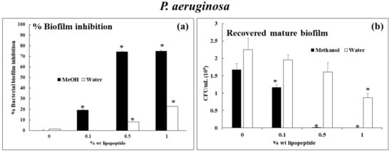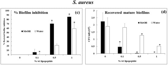 The ability of the lipopeptide gels to disrupt mature biofilms (7 days old) of P. aeruginosa and S. aureus was studied using a crystal violet staining assay. Crystal violet is known to bind to the exopolysaccharide matrix (EPS) in the biofilm. The stained biofilm can be solubilised upon addition of ethanol for a semi-quantitative estimation of the attached biofilm biomass. As evident from Figure 5a,c, hydrogel samples prepared in water did not completely eradicate (23% biomass reduction at 1 wt%) the mature biofilms of P. aeruginosa (Figure 5a). The 1 wt% lipopeptide in water eradicated up to 59% of the mature biofilms of S. aureus (Figure 5c). The 0.5 and 1 wt% lipopeptide-gels in methanol exhibit 70 to 86% reduction in biomass (Figure 5a,c) which is a promising result when it comes to eradicating mature biofilms of the two pathogens. Unlike the gel samples prepared in water, no mature biofilm cells were recovered from 0.5 wt% and 1 wt% methanol gel samples (Figure 5b,d).