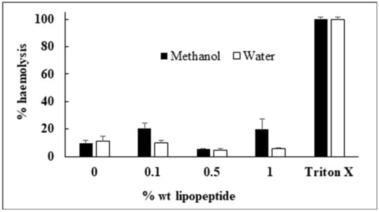 Both the gels prepared in methanol and water in the absence of the lipopeptide (0 wt%) showed negligible (9–11%) haemolysis against mouse blood cells. In the presence of the lipopeptide, a slight increase in haemolysis (5–20%) was observed but was within the expected range (≥20%) for peptide hydrogels reported in the literature [,,,].