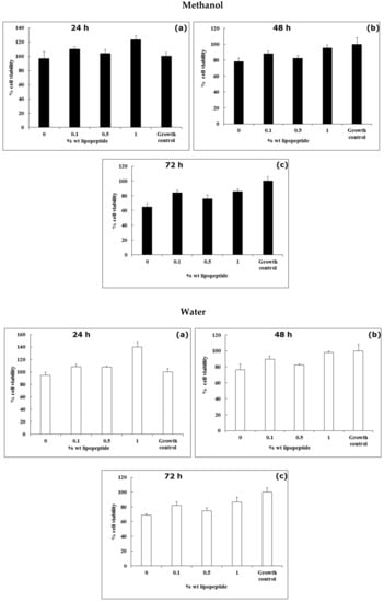 The results from the cell viability assay on the lipopeptide gels are shown in Figure 7. In general, cell viability was found to increase with increasing concentration of the peptides in the gels. It was observed that increased contact time had a detrimental effect on cell viability, which changed from 109 to 140% at 24 h to 75 to 86% in 72 h (Figure 7). The fact that >75% cell viability was retained after 72 h of contact with the lipopeptide gels prepared in both methanol and water is very encouraging and prove the non-cytotoxic nature of these lipopeptide gels against the human dermal fibroblasts, which is within the expected range (60–100%) for peptide hydrogels reported in the literature [,,,].