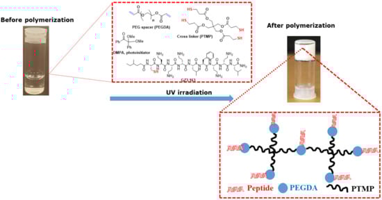 - Aimetti, A.A.; Machen, A.J.; Anseth, K.S. Poly(ethylene glycol) hydrogels formed by thiol-ene photopolymerization for enzyme-responsive protein delivery. Biomaterials 2009, 30, 6048–6054. [Google Scholar] [CrossRef] [PubMed]