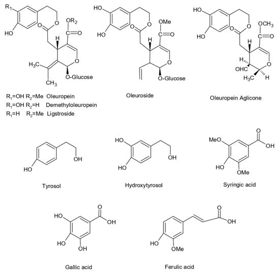The structure of the main phenolic compounds identified in Olea europaea L. extract are shown in Figure 2.