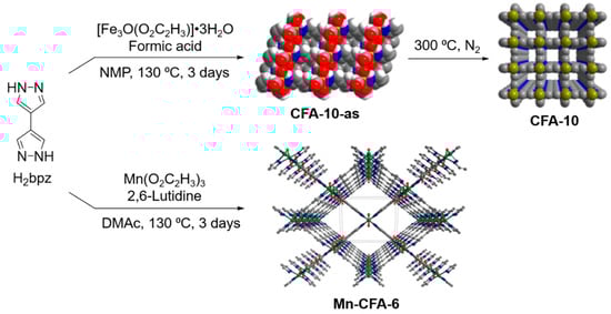 H2bpz was reacted with an iron source to yield CFA-10-as and CFA-10 [47] and with a manganese source to yield Mn-CFA-6. Adapted with permission from references [63,64]. ©2017 ACS.