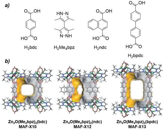 (a) Linkers used to make hydrophobic MOF-5 analogues. (b) Crystal structures of MAF-X10, MAF-X12 and MAF-X13 highlighting the pore surface. Adapted with permission from ref. [66].