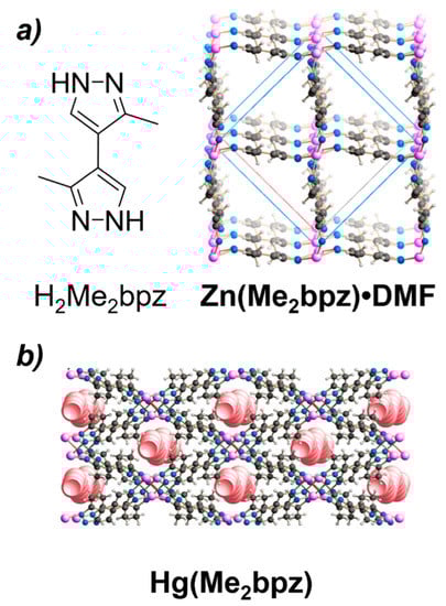 (a) The H2Me2bpz ligand and the resulting metal–organic framework Zn(Me2bpz)•DMF (DMF = N,N-dimethylformamide). DMF molecules in the pores have been removed for clarity. Co(Me2bpz) •DMF is isostructural to Zn(Me2bpz)•DMF. Adapted with permission from reference [79]. ©2017 ACS. (b) The 3D polymeric network Hg(Me2bpz), with the void spaces highlighted. Adapted with permission from reference [80].