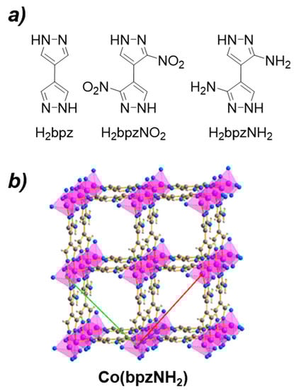 (a) The series of H2bpz derivatives. (b) Crystal structure of Co(bpzNH2), which is isostructural to Co(bpz) and Co(bpzNO2). Adapted with permission from reference [81]. ©2019 ACS.