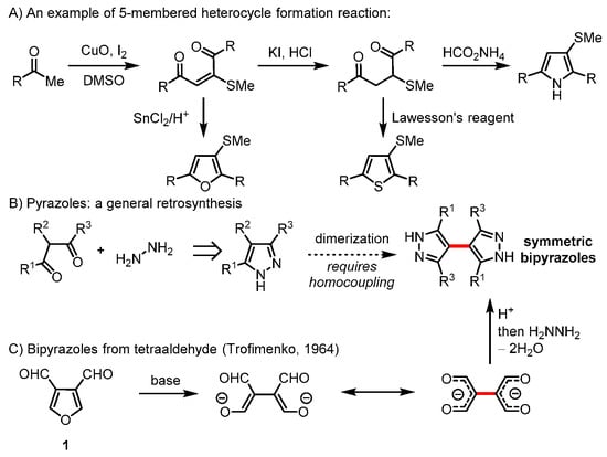 Condensation reactions of 1,4-dicarbonyl compounds with heteroatom nucleophiles can provide various 5-membered heterocycles: furans, thiophenes, pyrroles and their derivatives (Scheme 1A) [6,7]. To access pyrazoles with the same manner, 1,3-dicarbonyl compounds and hydrazine are required (Scheme 1B). However, the lack of a general method of “dimerization” of pyrazole substrates was a major bottleneck for the synthesis of symmetric bipyrazoles. Alternatively, diamino substrates can be prepared to access pyrazoles via oxidation reactions [8]. In 1964, Trofimenko reported the synthesis of 1,1,2,2-ethanetetracarbaldeyde, which was converted to bipyrazole by a condensation reaction with hydrazine (Scheme 1C) [9]. There are a few synthesis methods to access bipyrazoles via lengthy synthetic steps starting from diethyl succinate via a 3,4-carbonyl furan intermediate (1) [9,10,11].