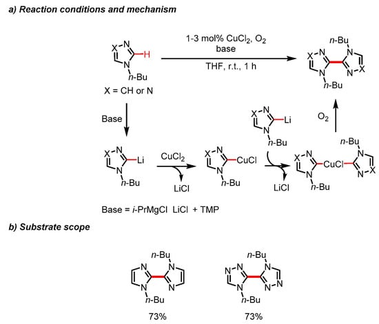 The (oxidative) Glaser–Hay coupling reaction utilizes Cu(I) species as catalysts in the presence of a base under air to afford homo-coupled alkyne products [16]. An adaptation of the Glaser–Hay coupling reaction conditions to N-substituted 1,2,4-triazoles was realized starting from easily accessible triazole compounds. In 2009, Do and Daugulis developed Cu(II)-catalyzed homocoupling reactions of imidazoles using molecular oxygen as a terminal oxidant (Scheme 3) [17]. The method developed proved useful in the coupling of various heterocycles, including examples of a N-butyl-substituted imidazole and triazole, providing the desired products in up to 73% yield. The mechanism of the reaction was suggested to proceed via deprotonation of heteroarenes (pKa < 35–37 for C2-H), followed by the complexation with metal additives, such as Li+. The trans-metalation step with the copper catalyst and subsequent oxidation yields the intermolecular homocoupling products between two arenes (Scheme 3).