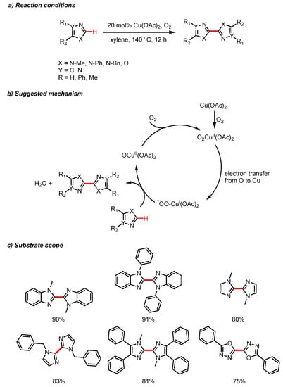 Li et al. reported Cu(II)-mediated homocoupling reactions using a similar system at elevated temperatures (Scheme 4) [18]. This method utilizes an efficient and convenient approach to form C2-C2 bonds via a Cu(OAc)2 and O2-mediated oxidative intermolecular homocoupling reaction between two azoles. Once again, the oxidative coupling could be used to achieve high yields of homocoupled products.