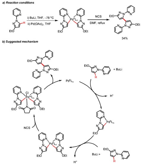 (a) Reaction conditions for the homocoupling of pyrazoles through formation of a bis(3-ethoxy-1-(pyridin-2- yl)-1H-pyrazol-5-yl) palladium complex followed by oxidation by NCS. (b) Suggested mechanism for the C–H activation followed by homocoupling.