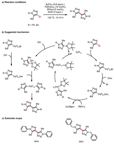 Afanas’ev et al. reported a method for the homocoupling of 4-bromo-1,2,3-triazoles to access the corresponding 4,4′-bistriazoles in quantitative yields [24]. The intermolecular homocoupling was achieved by mixing 4-brominated triazoles with 1.0 mol% Pd(OAc)2, in the presence of additives (pinB)2, SPhos and KOH. This method is practical due to the use of readily available starting compounds and a simple experimental procedure, without inert atmosphere or solvent. The reaction possibly occurs through the formation of a 4-Bpin-substituted 1,2,3-triazole. Then, in a Suzuki–Miyaura fashion, the homocoupling of the boronic acid can occur (Scheme 6b).