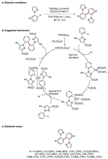 A palladium-catalyzed, pyrazole-directed C(sp2)−H functionalization of the N-phenyl ring in N-phenylpyrazoles to afford a biaryl bis-pyrazole (via dehydrogenative homocoupling) was reported by Batchu et al. [23]. Multiple factors were shown to have significant influences on the outcome of the reaction. For example, it was discovered that if the reaction was performed under ca. 10 times dilution, then no homocoupling product was observed, and N-(o-hydroxyphenyl)pyrazoles were the major or the sole products. The reaction mechanism is suggested in Scheme 7b. After the first C–H activation, the PdII-center is oxidized to PdIV, which undergoes a second C–H activation followed by a reductive elimination to yield the homocoupled bipyrazole.