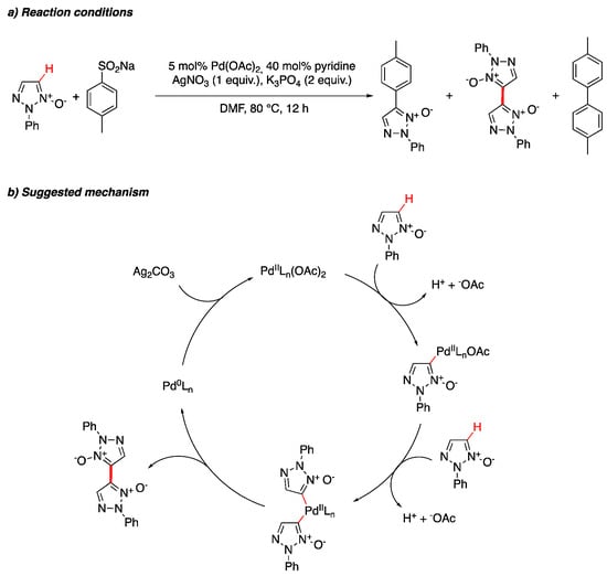 The homocoupling reaction between 1,2,3-triazole N-oxides by C–H activation at the C4 position was explored by Zhu et al. (Scheme 8) [26]. The reaction was designed to couple 1,2,3-triazole N-oxides with sodium arenesulfinates via palladium-catalyzed desulfitative cross-coupling, but it showed the possibility of homocoupling between 1,2,3-triazole N-oxides. Under unoptimized reaction conditions, the homocoupled N-oxide bistriazoles were generated with yields of up to 22%. The reaction likely occurs via deprotonation followed by exchange of OAc− for the deprotonated 1,2,3-triazole N-oxides. The di-triazole N-oxide PdII complex then undergoes reductive elimination to yield the homocoupled bistriazole N-oxide product and Pd0, which can be oxidized by Ag2CO3.