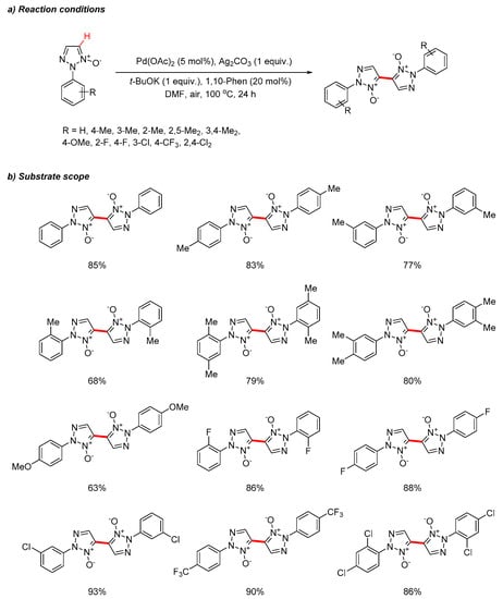 Later, the full scope of the homocoupling reaction between pyrazole-N-oxides was investigated by Peng et al. (Scheme 9) [27]. The method showed high regioselectivity towards C–H homocoupling of 1,2,3-triazole N-oxides, using a PdII catalyst (5 mol%), Ag2CO3 and 1,10-phenanthroline under air. Following their previous work, it was found that the addition of the base t-BuOK and a catalytic amount of 1,10-phenanthroline allowed for yields of up to 93%.