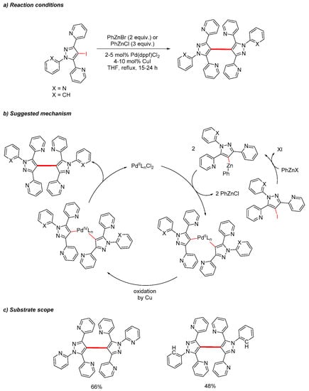 The homocoupling reaction between trisubstituted 4-iodo pyrazoles in the C4 position was investigated by Jansa et al. (Scheme 10) [25]. The pyrazoles contain two to three pyridinyl substituents, which are synthesized from the reaction of 1,3-dipyridinyl-1,3-propanediones with 2-hydrazinopyridine or phenylhydrazine, affording the corresponding 1,3,5-trisubstituted pyrazoles. Iodination at the 4-position of the pyrazoles was achieved by treatment with I2/HIO3. The coupling of two pyrazole rings was achieved under Negishi cross-coupling reaction conditions by employing organozinc halides in combination with a PdII catalyst.