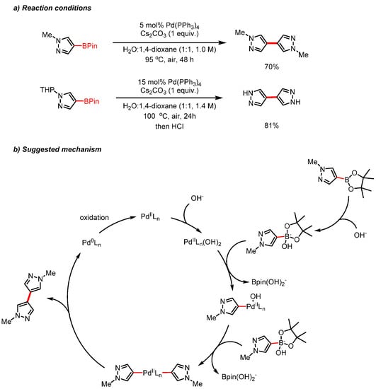 A more recent example of intermolecular homocoupling between two pyrazoles was discovered by Mercedes et al. (Scheme 11): through the palladium-catalyzed homocoupling of pyrazole boronic esters in the presence of air and water, 4,4-bipyrazole (H2bpz) and other symmetric bipyrazoles could be achieved [28]. The mechanism of the reaction is likely through a Suzuki–Miyaura-type cross-coupling between the boronic acids (Scheme 11b), with O2 being the oxidant for the Pd0 formed during the reductive elimination.