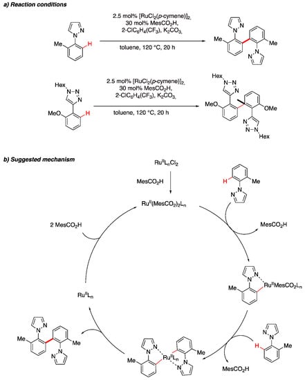 Ackermann et al. demonstrated the chemoselective ruthenium-catalyzed C(sp2)–H bond arylations on triazol-4-yl and pyrazol-2-yl substituted arenes (Scheme 12) [29]. The authors discovered that ortho-substituted arenes favored oxidative intermolecular homocoupling reactions to afford dimerized products in high (or moderate) yields. The suggested reaction mechanism follows a double C–H bond activation with carboxylate assistance, followed by reductive elimination.