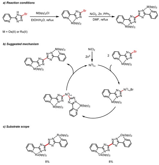 In 2000, Fanni et al. reported a new synthetic procedure for the efficient preparation of binuclear Ru(II) polypyridyl complexes, by performing intermolecular homocoupling between two 1,2,4-triazole bromide in the C3 position (Scheme 13) [32]. The halide functional group is necessary to mediate the Ni-catalyzed reaction in the presence of triphenylphosphine and a zinc reducing reagent.