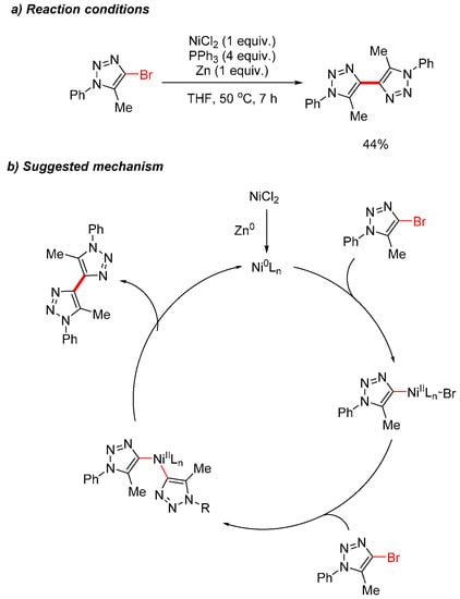 The homocoupling between 4-bromotriazoles has been reported by Afanas´ev et al. using in situ generated Ni0 as a catalyst (Scheme 14) [24]. The homocoupling functions via an in situ formation of Ni0(PPh3)4 from NiCl2 and Zn0, which undergoes oxidative addition of two equivalents of 4-bromotriazoles, followed by a reductive elimination to form the desired homocoupled products (Scheme 14b).