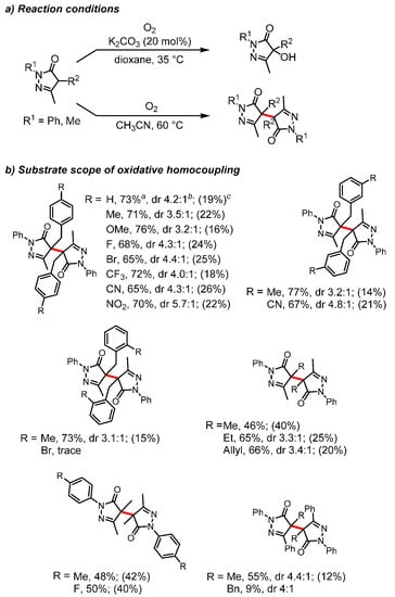 (a) A switchable aerobic oxidation of a pyrazol-5-one results in either hydroxylation or homocoupling, depending on reaction conditions. (b) Substrate scope of the oxidative homocoupling. [29]. a Isolated yields. b The dr values were determined by 1H-NMR. c Isolated yield of hydroxylated products.