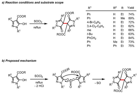 Another homocoupling reaction was recently shown to yield a structurally similar bipyrazolone, but through remarkably different conditions: By refluxing a substituted pyrazole in excess thionyl chloride, the bipyrazolone was produced in high yields (Scheme 18a) [46]. This reaction was successful for nine substrates in yields from 62–89%. (The authors do not provide diastereomeric ratios of meso compounds and racemate for each substrate, but they report that dimeric pyrazolone (R1 = Ph) appeared to be a racemic mixture by 1H-NMR spectroscopy and X-ray crystallography). The reaction was shown to proceed under an atmosphere of N2 and under air, ruling out oxidation by air as the mechanism, and the authors propose a hypothetical mechanism via a di(pyrazolyl) sulfite intermediate (Scheme 18b).