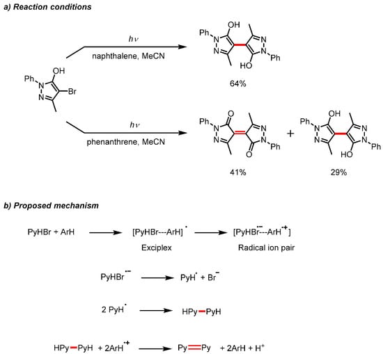 Photocatalysis represents an alternative metal-free approach to pyrazole homocouplings. An early report of the photochemical oxidation of pyrazolidinones led to a homocoupled product [49]. More recently, Meng and coworkers used photocatalysis to accomplish the homocoupling of a bromopyrazolone [50]. By irradiating a solution of 4-bromo-3-methyl-1-phenyl-4,5-dihydropyrazol-5-one (PyHBr) and naphthalene in acetonitrile with a 300 W high-pressure mercury lamp, the authors obtained the homocoupled product in 64% yield (Scheme 20a). Interestingly, the authors discovered that by substituting phenathrene for naphthalene the dehydrogenated product was favored over the hydrogenated product, and the use of other arenes such as anthracene, benzene, acenaphthylene or indole did not lead to homocoupling at all. As the reaction relies on certain arenes and does not proceed under UV irradiation alone, the authors ruled out the homolytic bond cleavage of the carbon–bromine bond as the mechanism and instead proposed the mechanism shown in Scheme 20b.