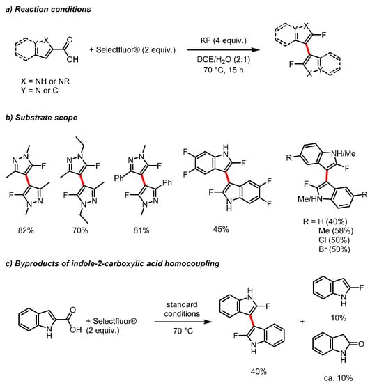 Finally, a recent report of the decarboxylative fluorination of various heterocycles using Selectfluor contained the unexpected observation of homocoupling under certain conditions [51]. Specifically, substituted pyrazole-5-carboxylic acids and indole-2-carboxylic acids underwent homocoupling along with decarboxylative fluorination, yielding the corresponding fluorinated dimers (Scheme 21a). The homocoupling occurred in high yields (70–82%) for the pyrazole-based substrates and in moderate yields (38–58%) for the indole-based substrates (Scheme 21b). In the case of indole-2-carboxylic acid, the biproducts 2-fluoroindole and oxindole were generated along with the dimer (Scheme 21c). Mechanistic investigations indicated that neither of these biproducts is an intermediate in the dimer formation process, but the mechanism of the homocoupling was not elucidated.