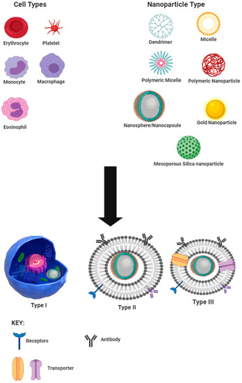 Type I, also known as the cell, involves encapsulation of nanoparticles into a cell or pathogen for shuttling the nanoparticle to the site of action and has been suggested as a treatment option for accessing the human immunodeficiency virus (HIV) with macrophages to treat central nervous system infection [26,27,28]. Type II or sub-membrane transfer systems make use of parts of cells, such as specific receptors, in order to detect receptor-specific substrates or perform the role of the cell component attached. This approach has been used for target/ligand-specific techniques for treating cancer using liposomes as the carrier technology [29,30]. Type III or total cell membrane transfer systems make use of whole membrane removal from cells and encapsulation of the nanocarrier with the cell membrane so as to mimic the cell from which the membrane is harvested.