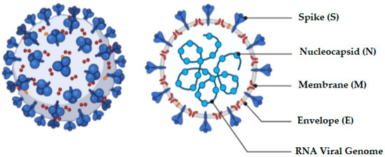 The coronavirus is a an enclosed, positive-sense, single-stranded RNA virus of approximately 30 kb capable of infecting a wide variety of host species [31]. The virus has four structural components, viz., spike, nucleocapsid, envelope, and membrane proteins [32], and the appearance of the virus and associated proteins are depicted in Figure 2.