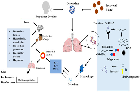 ACE-2 is a trans-membrane protein that has been characterized for its homeostatic role in counterbalancing the impact of ACE on the cardiovascular system (CVD) [43]. Angiotensin I is converted to angiotensin II, a highly active octa-peptide that causes contraction of blood vessels to increase pressure and blood flow in addition to exhibiting pro-inflammation activities. ACE-2 activity of carboxypeptidase leads to the conversion of angiotensin II into hepta-peptide angiotensin, which is known as the functional antagonist of the angiotensin II enzyme [34]. The high expression of ACE in the endothelial cells of the vasculature in the lungs results in a high probability of the presence of angiotensin II within the lung cells, which contributes to interference with pulmonary vasculature regulation [44]. Type-II alveolar pneumocytes directly mediate the innate activity of the pro-inflammatory response of the SARS-CoV-2 in the lower respiratory tract due to the presence of ACE-2 in these cells. Type-II pneumocytes function as cells capable of producing interleukin (IL)-6, tumor necrosis factor (TNF)-α, granulocyte macrophage colony-stimulating factor (GM-CSF), monocyte chemoattractant protein (MCP)-1, and IL-1β in the pulmonary system [45]. As illustrated in Figure 3, infected lung cells cause an increment in the levels of pro-inflammatory cytokines leading to endothelial dilation of alveolar cells, which is responsible for a decrease in the alveolar surface tension through accumulation of surfactant in pulmonary cells, hypovolemia, increased capillary permeability, alveolar edema, and hypoxemia [45]. Infected pulmonary tissues are also an indirect mechanism that induces multi-system organ dysfunction, which is characterized by acute lung failure, acute kidney injury, acute liver failure, cardiovascular diseases, as well as a wide spectrum of the hematological abnormalities, including neurological disorders [44]. In addition, the presence of IL-6, IL-1β, and TNF-α has an effect on the hypothalamus region of the brain, which controls body temperature [34] and which may induce fever, which is a potential symptom of coronavirus infection. The possible infection cascade and classification based on pathological manifestation is depicted in Figure 3.