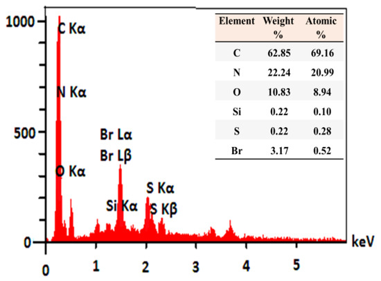 Energy dispersive spectroscopy (EDS) analysis was also performed to further analyze BC@GCN-P-IL. As shown in Figure 3, C, N, O, Br, Si and S atoms were detected in EDS analysis. C, N and O atoms are representative of BC@GCN. Notably, C and O atoms are also indicative of AA. The presence of Br, along with C and N atoms, on the other hand, can be ascribed to the P-IL moiety.