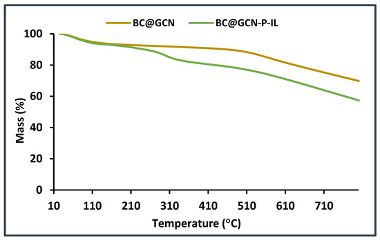 To further approve the conjugation of P-IL on the backbone of the catalyst, TG curves of BC@GCN and BC@GCN-P-IL were recorded, Figure 5. Comparison of the two recorded curves demonstrated that the thermal stability of BC@GCN-P-IL was inferior compared to BC@GCN. In fact, BC@GCN exhibited only two weight losses at 120 °C and 510 °C [67]. In the TG curve of BC@GCN-P-IL, an additional weight loss at the range of 240–320 °C (10 wt %) could be detected that corresponded to the degradation of P-IL.