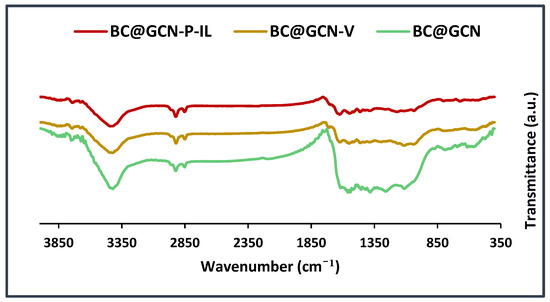 The next characterization technique was FTIR spectroscopy. To verify the formation of each intermediate, the FTIR spectra of BC@GCN, BC@GCN-V and BC@GCN-P-IL were recorded and compared, Figure 6. As illustrated, the FTIR spectrum of BC@GCN showed the absorbance bands at 3418 cm−1 (–OH functionality), 2920 cm−1 (–CH2 functionality), 1623 cm−1 (–C=C functionality), 1033 cm−1 and 1409 cm−1 (–C-O functionality). The FTIR spectrum of BC@GCN-V contained the absorbance bands observed in BC@GCN. Moreover, an additional band at 1723 cm−1 can be discerned in this spectrum that is indicative of conjugation of 3-TMSPMA. FTIR spectrum of BC@GCN-P-IL also exhibited the bands of BC@GCN and an additional band at 1700 cm−1 that is indicative of the carbonyl functionality in polymeric moiety. Notably, the main characteristic band of IL moiety, i.e., –C=N band overlapped with the bands of BC@GCN.