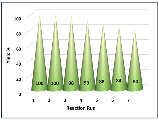 Typically, all of the reagents, i.e., aldehyde (1 mmol) and malononitrile (1.2 mmol) were mixed in H2O and then BC@GCN-P-IL (0.02 g) was added. The obtained mixture was stirred for 2 h at ambient temperature. Knoevenagel condensation was simply traced by TLC (Merck Co., Readington, NJ, USA). At the end, MeOH (10 mL) was added and BC@GCN-P-IL was separated through conventional filtration. The recovered catalyst was reused five times in the model reaction after washing with MeOH and drying at 70 °C overnight. To obtain the Knoevenagel condensation products, the solvent was evaporated under vacuum and products were purified by column chromatography (ethyl acetate/hexane 1:5) (Agilent, Santa Clara, CA, USA). All of the products were synthetic [66] and their characterization was performed by comparing their melting points and spectral data (1H NMR and 13C NMR) with authentic samples. Moreover, the yields of the reactions were estimated by using GC (Agilent, USA).