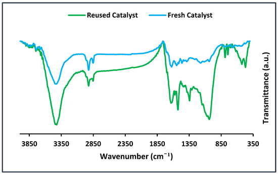 In the next part of this research, the recycled BC@GCN-P-IL was characterized via FTIR spectroscopy to elucidate the origin of the decrement of its activity. As shown in Figure 8, the FTIR spectrum of the recycled BC@GCN-P-IL was distinguished from fresh BC@GCN-P-IL. As shown, the intensities of the absorbance bands in fresh and reused catalysts were different. On the other hand, some new absorbance bands could be observed in the recycled catalyst. For example, the bands at 744–780 cm−1 and sharp bands at 1350–1400 cm−1 could be discerned in the FTIR spectrum of the reused catalyst. This issue can be attributed to the deposition of the products on BC@GCN-P-IL. In fact, coverage of the active sites of BC@GCN-P-IL could justify the observed loss of the activity.