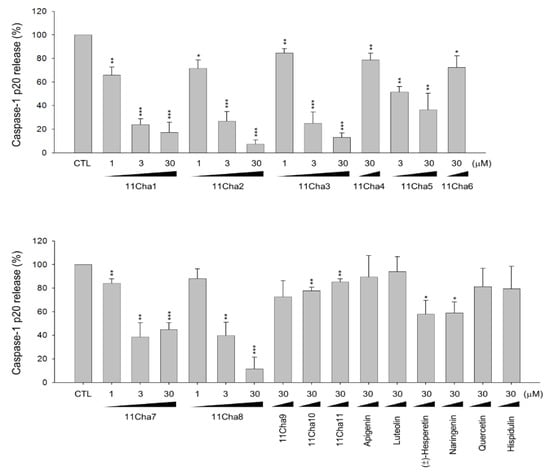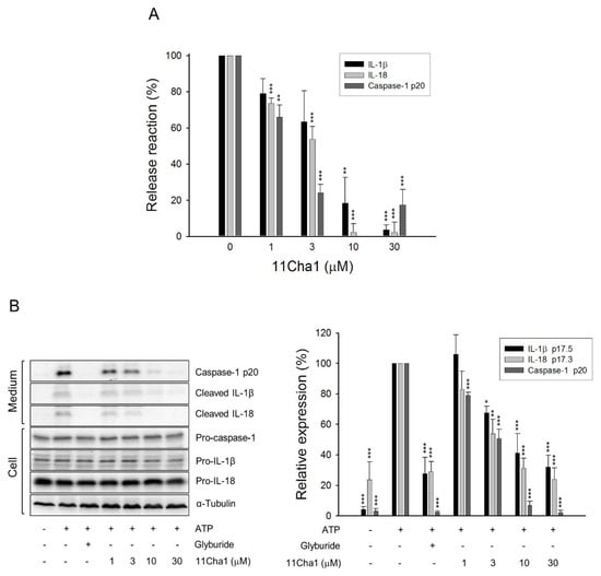 Upon NLRP3 inflammasome activation, autoproteolysis of pro-caspase-1 produced large (p20) and small (p10) cleavage fragments of the catalytically active enzymes, leading to the cleavage of pro-IL-1β and pro-IL-18 into their secreted active forms [9,21,22]. The detection of release reaction in the medium using ELISA system demonstrated that 11Cha1, by itself without cytotoxic effect (Supplementary Materials Figure S1), caused a concentration-dependent inhibition of ATP-induced caspase-1 activation and the release of IL-1β and IL-18 in LPS-primed macrophages with IC50 values of 1.5 ± 0.1, 4.9 ± 1.8, and 3.2 ± 0.5 µM, respectively (Figure 2A). Western blotting analysis further substantiated that 11Cha1 significantly inhibited ATP-mediated release reaction in LPS-primed macrophages with IC50 values of 2.8, 6.7, and 1.4 µM, respectively (Figure 2B). The results suggest that 11Cha1 displays an inhibitory activity on the inflammasome activation.