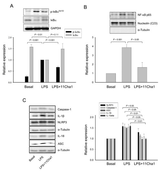 NF-ĸB plays a key role in the priming step of NLRP3 inflammasome activation through inducing the transcriptional expression of inflammasome components in response to LPS/toll-like receptor 4 (TLR4) signaling activation [8,9,10,21,23]. We performed an experiment that after the treatment of cells with LPS for 8 h, the medium was replaced with LPS-free fresh medium for a further 16-h incubation to allow IL-6 production. The data showed that 11Cha1 significantly inhibited the IL-6 release in LPS-free condition, suggesting the inhibition of intracellular but not extracellular signaling to 11Cha1 action (Supplementary Materials Figure S2). The effect of 11Cha1 on the regulation of NF-ĸB activation was determined. NF-ĸB activation needs the phosphorylation and proteolytic degradation of the inhibitory subunit IĸB-α. The data demonstrated that a 30 min-exposure to LPS induced a profound increase of IĸB-α phosphorylation associated with its proteolytic degradation. These effects were significantly inhibited by 11Cha1 (Figure 3A). NF-ĸB activation is connected to the nuclear translocation of p65 component of the complex. The nuclear extracts were prepared showing that LPS induced a dramatic increase of nuclear translocation of NF-ĸB p65 subunit. The effect also was significantly inhibited by 11Cha1 (Figure 3B). Notably, LPS significantly increased the protein expression levels of NLRP3, pro-caspase-1, ASC, IL-18, and IL-1β. 11Cha1 resulted in a profound suppression on these proteins except for NLRP3, which showed an inhibitory trend (Figure 3C).