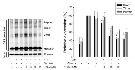 Effect of 11Cha1 on ATP-induced ASC dimerization and oligomerization. THP-1 cells were seeded and differentiated by 50 nM PMA for 48 h and then primed with 1 μg/mL LPS for 4 h. The cells were pre-treated with or without the indicated agent for 30 min (200 µM glyburide as the positive control) and then treated with 5 mM ATP for another 2 h. After treatment, the cells were harvested for the detection of the protein expressions of ASC dimerization and oligomerization. Data are expressed as mean ± SEM of at least three independent determinations. One-way ANOVA by Newman Keuls post hoc test was used. * P < 0.05 and ** P < 0.01 compared with ATP-treated control. The analyses of P (ANOVA) indicated P < 0.01 in all tests.
