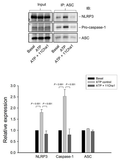 Effect of 11Cha1 on ATP-induced interaction between NLRP3, pro-caspase-1, and ASC. THP-1 cells were seeded and differentiated by 50 nM PMA for 48 h and then primed with 1 μg/mL LPS for 4 h. The cells were pre-treated with or without 11Cha1 (30 µM) for 30 min and then treated with 5 mM ATP for another 2 h. After treatment, immunoprecipitation and immunoblotting experiments were performed. Data are expressed as mean ± SEM of four independent determinations. One-way ANOVA by Newman Keuls post hoc test was used. The analyses of P (ANOVA) indicated P < 0.001 in all tests.