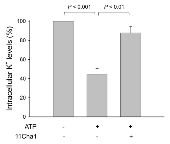 Effect of 11Cha1 on ATP-induced K+ outflow from cells. THP-1 cells were seeded and differentiated by 50 nM PMA for 48 h and then primed with 1 μg/mL LPS for 4 h. The cells were pre-treated with or without 11Cha1 (30 µM) for 30 min and then treated with 5 mM ATP for another 30 min. After treatment, intracellular potassium content was determined using Potassium Assay Kit (MyBioSource, San Diego, CA, USA) according to manufacturer’s protocols. Data are expressed as mean ± SEM of five independent determinations. One-way ANOVA by Newman Keuls post hoc test is used. The analyses of P (AVOVA) indicates P < 0.001.