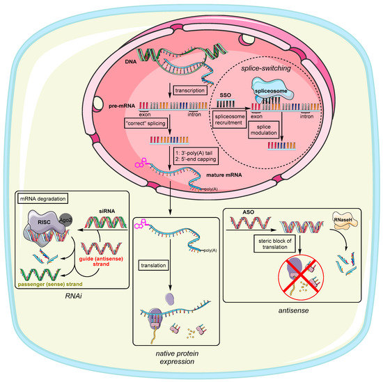 Splice-switching ON (SSO) are a variation of ASO that interact with nuclear pre-mRNA during the splicing process, thus altering exon inclusion, exclusion, or choice in general (Figure 1) [24]. SSO are usually administered to treat genetic disorders, which are consequences of genetic mutations within these exons [25]. For this reason, there are many starting points for SSO to literally splice out defective genes. Exons in general are the coding sections of genes interspersed with introns, i.e., non-coding sequences within the pre-mRNA transcript [26]. During the splicing process, the exons containing the transcript for proteins are fused together by the spliceosome, thus leaving out the introns [27]. The spliceosome therefore has to bind to specific splicing sites, by which the order of exon combination can also be altered (alternative splicing) [28]. This offers two options to restore correct splicing. First, an exogenous ASO is designed to base-pair to a (non-natural) splicing enhancer sequence [29] created through mutation [30]. Blocking this site causes the machinery to skip this exon leaving out genetic disinformation. Second, an ASO can be designed to base-pair with a splicing silencer sequence. This prevents binding of a negatively acting splicing protein, ultimately causing inclusion of original exons that were skipped before (through mutation) [31]. Approved SSO therapeutics are Nusinersen [32,33] for the treatment of spinal muscular atrophy, Golodirsen [34,35] and Eteplirsen [36,37] to treat Duchenne muscular dystrophy, and Milasen [38], a pioneering example of personalized medicine to treat Mila Makovec’s form of batten disease.