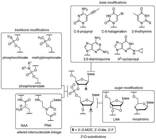 A modification that is indispensable and has been employed in the structures of Fomivirsen and Mipomersen is the phosphorothioate (PS) backbone (Figure 2). The introduction of non-bridging sulfur at the phosphate unit furnishes a novel stereogenic center at the phosphorus atom [72], resulting in diastereomers with either (SP) or (RP) configurations. These show different properties in terms of nuclease stability and binding affinity to the complementary (target) strand [17,18]. The ‘stickiness’ of sulfur further enables binding to plasma proteins such as albumin [73] or other biopolymers like heparin [74]. As a result, it leads to prolonged plasma half-lives [75] and reduced renal excretion. For PS backbones in ON, one has to consider possible toxic side effects though [76]. Together with the electroneutral methylphosphonate modification [77], the PS backbone belongs to the group of so-called ‘first generation’ modifications. Increased nuclease stability can also be achieved via electronic properties contrary to native ON structures, for instance by introducing positively charged nucleoside analogues [8,78] to create partially zwitterionic backbone structures [79,80,81]. A site-specific introduction of such cationic nucleosyl amino acid (NAA)-modifications enhances the stability of the resultant partially zwitterionic ON towards 3′- and 5′-exonucleases and in more complex biological media (human plasma, human cell lysates).