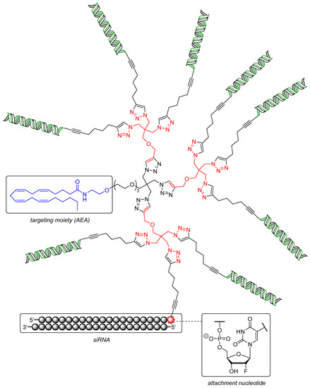 Structure of the dendritic siRNA-containing construct AEA-[9siRNA] equipped with an anandamide (AEA) targeting moiety (blue) and branching units (red: triazido pentaerythritol motif). The siRNA passenger strand (green) is covalently attached to the dendritic scaffold via a uridine-derived attachment nucleotide.