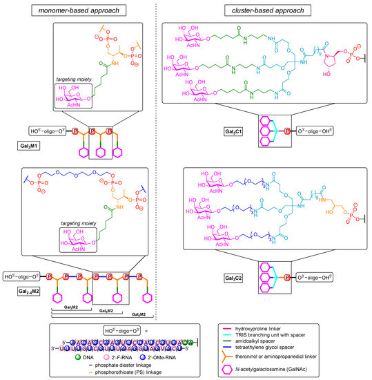 Khvorova, Watts et al. demonstrated the two main approaches by which GalNAc motifs might be linked to therapeutic ON (Figure 5) [298]. The first strategy, termed ‘cluster-based approach’, follows the design principle of the aforementioned trivalent structure that is also used in the controversial drug candidate Revusiran [311,312] (Gal3C1, Figure 5). Furthermore, it comprises an aminopropanediol-linked GalNAc dendrimer for 3′-end triantennary conjugates (Gal3C2, Figure 5). The acyclic aminopropanediol linker has also been used with tetraethylene glycol spacers instead of amidoalkyl units in order to reduce hydrophobicity. Such multivalent dendrimers could also be installed post-synthetically via solution-phase chemistry at both ends of the ON. The second strategy constructs GalNAc cluster structures by multiple couplings of GalNAc-derived phosphoramidites (to furnish up to four repeating units) and is termed ‘monomer-based approach’. The phosphoramidite monomer is based on l-threoninol with an amidoalkyl linker to the GalNAc unit (Gal3M1, Figure 5). The successively introduced targeting units can also be further separated by tetraethylene glycol spacers (Gal2-4M2, Figure 5) to ensure optimal topology for binding to the heterooligomeric receptor [301]. However, both monomer-based structures were installed on solid support to afford 3′-end conjugates at the sense strand of a 22-mer siRNA that was further modified (i.e., 2′-O-methyl, 2′-fluoro, partial PS backbone). Cy3 was additionally introduced as a fluorophore at the 5′-end of the sense strand to monitor biodistribution. The new dendritic trivalent GalNAc conjugate and the novel linear tetravalent conjugate showed higher hepatocyte binding in FVBN/J mice than a comparable conjugate that already is in clinical trials [299,313]. Gal3C2 gave 2-fold, Gal3M1 1.5-fold, and Gal4M2 even 3-fold increased association compared to Gal3C1 [299], and the same was found for liver accumulation. To investigate the silencing efficacy, structures were applied that targeted endogenous cyclophilin B (PPIB) [314]. The inhibition of cyclophilin proved to be effective for suppressing the replication of HCV [315,316,317]. All dendritic trivalent conjugates showed dose-dependent silencing of PPIB mRNA expression that was slightly better than for linear Gal4M2 (~60% at a dose of 2.5 mg/kg, 80% at 10 mg/kg after 48 h), representing a 2-fold increased potency relative to non-targeted controls. They were also recovered from the liver in 2-fold higher amounts than their linear counterparts. Of the linear multivalent conjugates Gal2M2, Gal3M2, and Gal4M2, the latter exhibited a stronger silencing effect and higher accumulation in the liver. This outcome observed for a tetravalent targeting moiety attached to siRNA is in some contrast to previous results for ASO [318,319], for which bivalent targeting moieties exhibited at least equal silencing than trivalent derivatives. This might demonstrate that the topology of such targeting units can be more relevant than valency for efficient receptor binding [320] with small molecules.