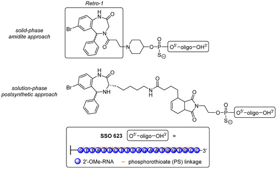 Juliano et al. [345] prepared three Retro-1 derivatives, covalently attached to the 5′-end of a 20-mer PS SSO with 2′-O-methyl modifications via conventional amidite coupling on resin, or via Michael-type click reaction and Diels-Alder cycloadditon (post-synthetic, solution-phase reactions, Figure 6). The conjugates were tested in a luciferase reporter gene assay with the well-known splice switching ON sequence SSO 623 [176] in HeLa Luc 704 cells. Unfortunately, none of the novel conjugates afforded an improvement in splice-switching activity over the dual use of SSO 623 with UNC7938 as a widely used endosome-destabilizing agent [344,346] or even SSO 623 alone. The reasons for this have not been elucidated yet, but ongoing research attempts to use more potent analogues of Retro-1 [344,347] or variations of spacer units to overcome possible impairments with the splice-switching machinery.