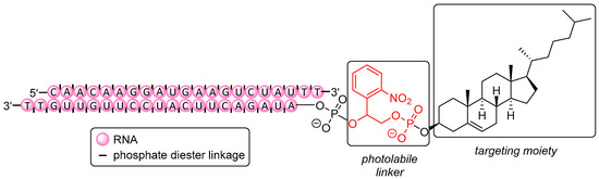 Tang et al. [368] have described the conditional regulation of gene expression via spatiotemporal control of silencing activity with light as a non-invasive trigger (Figure 7). Therapeutic activity of small molecules [369] or ON [370] can be blocked (‘caged’) with photolabile moieties (PL), e.g., NPE [371], NPP [372], NPOM [373], and DMNPE [374]. In the case of ON, the photolabile units render them unable for hybridization when such units are attached to nucleobases, thus disturbing Watson-Crick base pairing. On the one hand, ON are thus more protected against immune response or exonuclease degradation [375,376], and on the other hand, they do not exhibit any premature silencing activity leading to off-target effects. As shown by Tang et al., attaching such a PL together with cholesterol to the 5′-end of the antisense strand of a 21-mer siRNA designed for downregulation of the Ago2 protein (Figure 7) resulted in failure to form the RISC [377]. However, photo-induced release (λ = 365 nm) of native siRNA took place within just a few minutes, rendering the ON active again. Photomodulation of gene expression was also proven by effective silencing (after irradiation) of mitotic kinesin-5 (Eg5) mRNA (that is crucial for mitosis [378,379]) using a photolabile conjugate. Compared to a positive control at 5 nM (non-caged siRNA), Eg5 mRNA expression was slightly less reduced using the conjugate (80% vs. 60%), but the total amount of cells arrested in the G2/M phase was nearly the same (40%), showing the photo-activatable conjugate to be similarly potent as the parent drug.