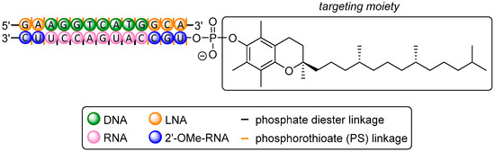 Several studies have been reported in which therapeutic ON were conjugated with α-tocopherol (α-TP) for the purpose of efficient gene silencing [354,383,384,385,386,387]. α-TP is one out of four tocopherol congeners (α, β, γ, δ) that show inherent antioxidant [388], anticancer [389], anti-inflammatory [390], immuno-stimulatory [391], and nephroprotective properties [392,393]. Together with the three-fold unsaturated analogues, i.e., the four tocotrienols, they form the vitamin E family, a major bioactive class of essential nutrients for human metabolism [394,395]. Tocopherols are therefore considered to be effective ligands for drug delivery of poorly internalized ON therapeutics, also with respect to their active protein-mediated uptake [396,397], as described by Nishina et al. with the first α-TP conjugate. A 27/29-mer siRNA [383] having α-TP connected to the 5′-end of its antisense strand as well as several standard modifications (2′-O-methyl, partial PS backbone; structure not shown) was designed to reduce expression of endogenous ApoB in the liver, in order to reduce cardiovascular events after the dicer-assisted formation [398] of mature 21-mer siRNA including cleavage of the α-TP targeting unit. The stability of the conjugate in mouse serum was improved 4-fold as compared to the non-conjugated siRNA (that was fully degraded after 8 h). As shown via confocal imaging, the α-TP conjugate was readily taken up by the liver, thus delivering the 27/29-mer as well as the mature 21-mer siRNA, whereas uptake of non-conjugated siRNA could not be found. Levels of endogenous ApoB-encoding mRNA in the liver were evaluated 48 h after administration of the conjugate in C57BL/6 mice and were decreased by 50%, whereas no silencing with non-conjugated reference siRNA was observed at a dose of 2 mg/kg.