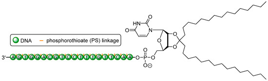 Squalene (SQ) is an endogenous triterpene, produced in the liver and skin as precursor in the biosynthesis of steroids such as cholesterol [410,411]. Due to its high hydrophobicity, conjugation of squalene to the 5′- or 3′-end of an ON furnishes a highly amphiphilic construct tending to self-aggregate to nanostructures, ultimately leading to increased plasma stability without the need for formulating agents. This kind of self-aggregation might save the potential patient from undesired side effects related to the toxicity of common formulations [412,413] or a burst release of the drug from the formulation [414]. The concept of squalenylation has already been used in the context of drug delivery [415,416,417,418,419] since its first application to improve the delivery of gemcitabine, a cytotoxic nucleoside analogue used in anticancer chemotherapy [420].