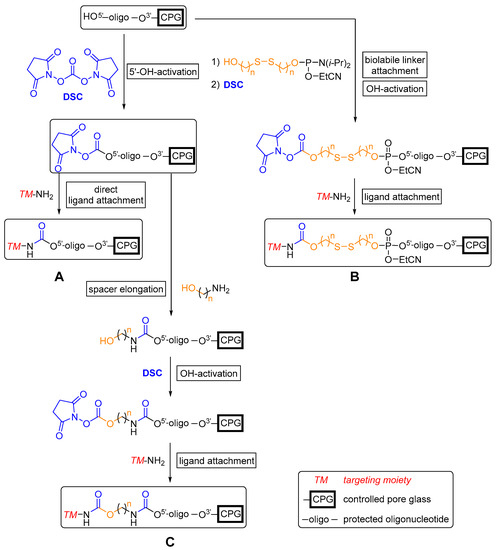 Recently, Venyaminova et al. [284] reported the development of a new solid phase-supported approach to attach several functional amino-modified ligands, in particular estrone, to the 5′-end of protected (dT)7 ON model sequences by N,N’-disuccinimidyl carbonate (DSC)-mediated carbamate formation (Scheme 1). This strategy enabled variations in the length and size of spacer units, e.g., hexamethylenediamine, between an ON and (multiple) amino-modified ligand(s) by several successive reactions. Employing this methodology can overcome issues correlated with post-synthetic approaches such as the search for a suitable solvent (mixture) for post-synthetic modifications with highly hydrophobic entities. Furthermore, the often moderately yielding syntheses of phosphoramidite derivatives of effector molecules is rendered obsolete. A straightforward introduction of an amino group in a position that does not impede receptor interaction is thus sufficient for the conjugation of small molecules with therapeutic ON on resin.