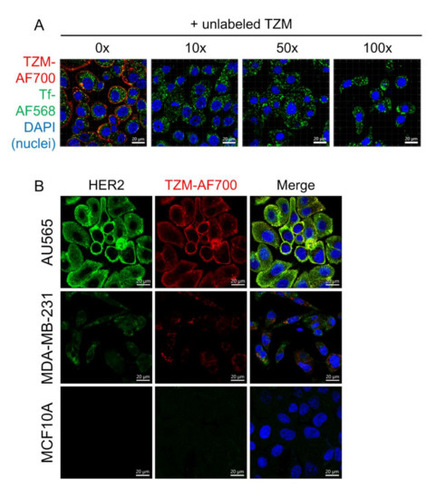 Comparison of intracellular uptake of TZM–AF700 into HER2-positive and HER2-negative cell lines. (A) To test the specificity of HER2-mediated TZM–AF700 binding and internalization, competition experiments were performed. AU565 cells were loaded with 5 µg/mL TZM–AF700 (red) and 5 µg/mL Tf-AF568 (green) in the presence of increasing amounts of unlabeled TZM. Single slice confocal microscopy displays TZM–AF700 (red) and Tf–AF568 (green) binding and internalization into AU565 cells in the presence of increasing 0×, 10×, 50×, and 100× unlabeled TZM. (B) HER2-positive AU565 and HER2-negative MDA-MB-231 and MCF10A cells were subjected to 24 h uptake of 20 µg/mL TZM–AF700 (red) and then processed for anti-HER2 immunostaining (green). Nuclei were visualized with DAPI (blue). Maximum intensity projections of z-stacks consisting of 6–8 optical slices are shown. Confocal images were collected using identical settings on an LSM880 confocal microscope. Scale bar = 20 µm.