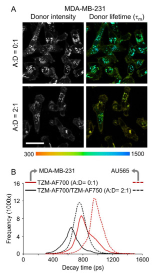 TZM FLIM-FRET analysis in MDA-MB-231 cancer cells. (A) The representative TCSPC images of fluorescence intensity and mean lifetime map (τm) in cells treated with TZM–AF700 (A:D = 0:1) or with TZM–AF700 plus TZM–AF750 (A:D = 2:1) pseudo-color range = 300–1500 ps. Scale bar = 50 µm. (B) Comparison of fluorescent lifetime distribution in MDA-MB-231 (solid lines) and AU565 cells (dashed lines) treated with TZM–AF700 (A:D = 0:1 red), TZM–AF700 plus TZM–AF750 (A:D = 2:1 black).